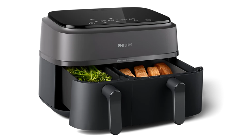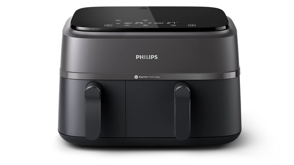 اولین چیزی که در فیلیپس NA350/00 جلب توجه میکند، طراحی نوآورانهی دو سبدهی آن است. این دستگاه به دو کشوی پخت مجزا با ظرفیتهای متفاوت مجهز است: یک سبد بزرگ ۶ لیتری و یک سبد کوچکتر ۳ لیتری که در مجموع، ظرفیت پخت چشمگیر ۹ لیتر را برای ۸ نفر فراهم میکنند. این طراحی هوشمندانه به شما اجازه میدهد تا دو نوع مادهی غذایی مختلف را به صورت همزمان و با تنظیمات دما و زمان متفاوت، بدون تداخل بو یا طعم، آماده کنید. برای مثال، میتوانید در یک سبد، سیبزمینی سرخکردهی ترد و طلایی و در سبد دیگر، قطعات مرغ سوخاری آبدار را همزمان بپزید. بدنهی دستگاه از پلاستیک با کیفیت و مقاوم ساخته شده و با ابعاد ۳۸.۳ در ۴۴.۴ در ۳۱.۴ سانتیمتر و وزن ۷.۸۵ کیلوگرم، حضوری متعادل و مدرن در آشپزخانهی شما خواهد داشت. پنل کنترل دیجیتال لمسی با نمایشگر LED، علاوه بر زیبایی، دسترسی آسان و دقیقی به تنظیمات دما، زمان و برنامههای پخت پیشفرض را فراهم میکند.